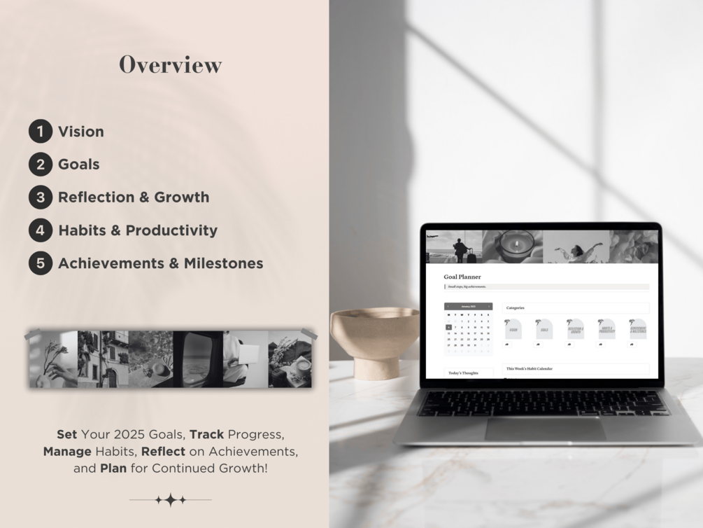 Notion Goal Planner, Goal Setting Planner for 2025, Life Vision Dashboard, Monthly Habit Tracker, Productivity Organizer, Task Tracker Log, Notion Aesthetic