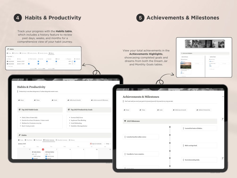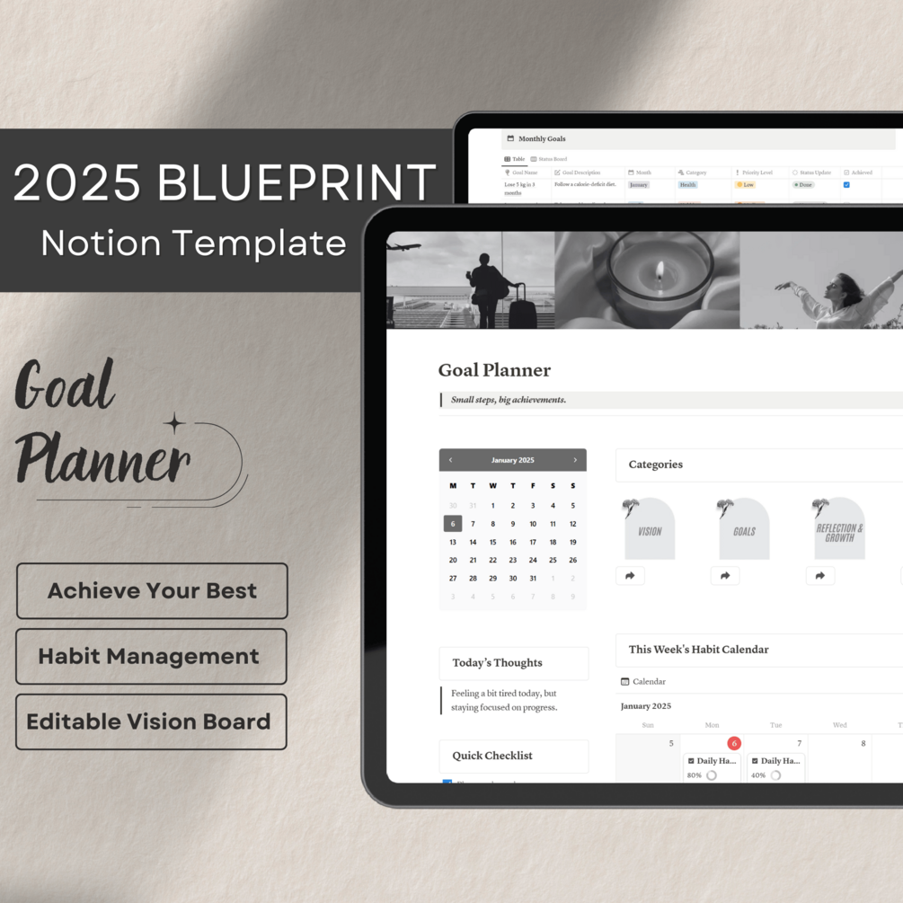 Notion Goal Planner, Goal Setting Planner for 2025, Life Vision Dashboard, Monthly Habit Tracker, Productivity Organizer, Task Tracker Log, Notion Aesthetic