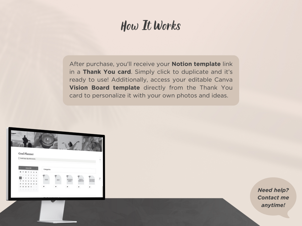 Organize your vision and set meaningful goals with the 2025 Notion Goal Planner. This template includes a Vision Board section where you can personalize your board by adding editable Canva images directly from your Thank You card. Perfect for users who want to visually plan and reflect on their aspirations, whether it's for business or personal growth.